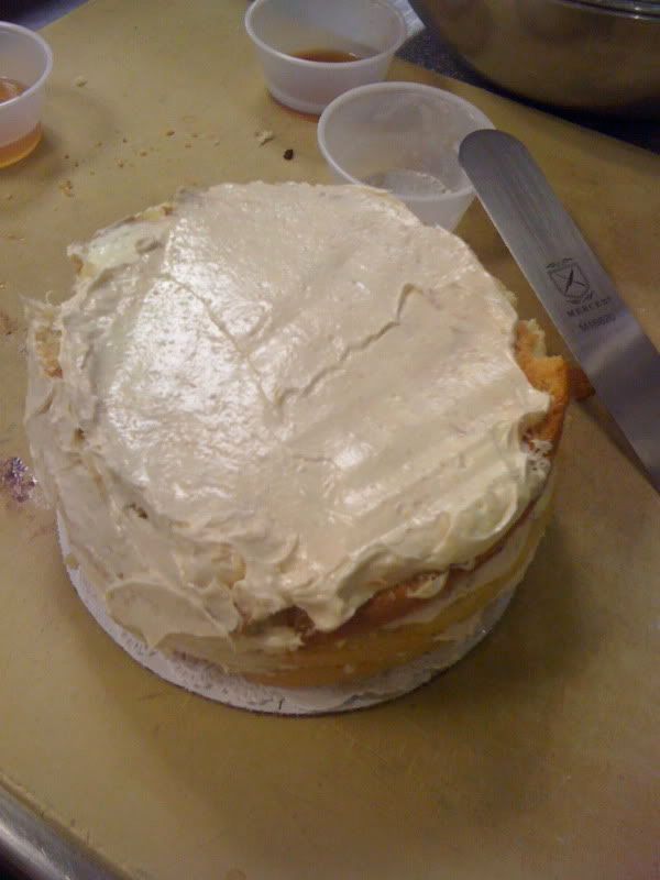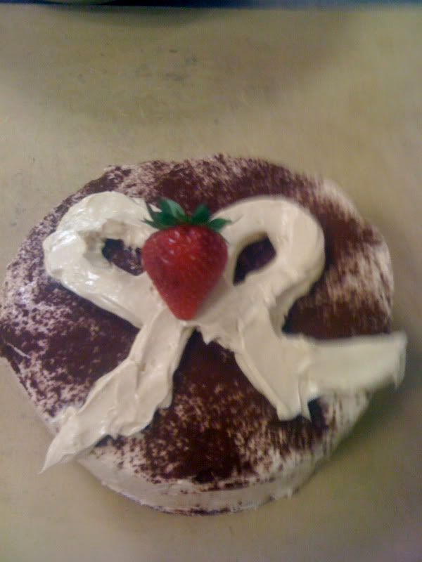 I quickly learned that you can't really "wing it" when it comes to baking. I didn't incorporate enough air(by beating) in my little cake, and I also didn't allow it to bake long enough, so it came out with a gooey center and didn't rise too well. I tried to cover this up with extra frosting, but ended up spreading cake crumbs all over, so I covered the frosting up with cocoa powder. Uhh.. overkill?
