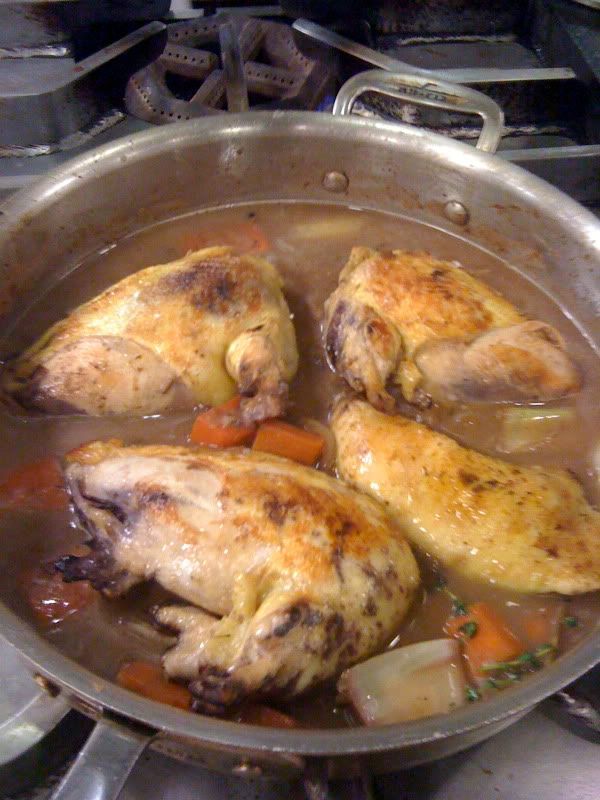 Then, we made Coq au Vin, or more appropriately Poulet au vin rouge, for our first session in Level 2. The dish is usually made with older, tougher chickens and stewed for a very long time to tenderize the meat. We just used the little purdue birds that we butchered during our practical and left to marinate in red wine for a few days. Since my partner did the lamb, I wanted to at least take over with the chicken.
