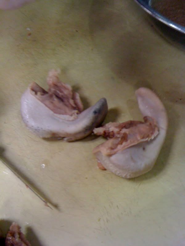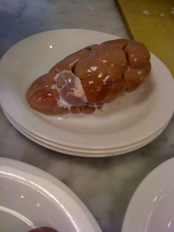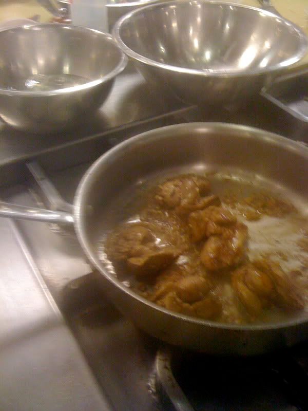 Unfortunately we didn't get to play with any feet in class. I'm really curious about pig's feet and chicken feet and don't remember ever trying them. We did have sweetbreads, though. They're actually an animal's thymus gland, and how they came to be known as "sweetbreads" is sort of a mystery. We made sweetbreads from calves, which tend to be larger because they shrink as the cow grows.