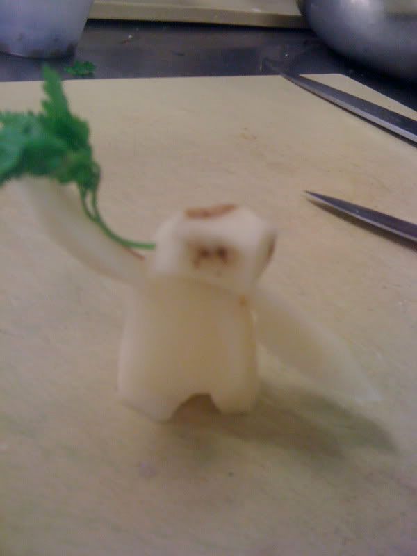 After all the organ cooking, we had time to practice tournage. And my partner had enough time to carve this cute little potato penguin: